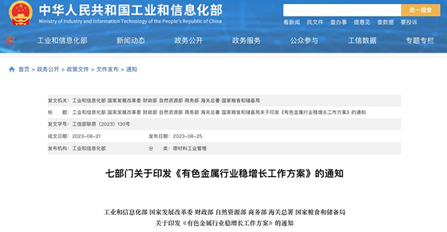 工業(yè)和信息化部、國(guó)家發(fā)展改革委、財(cái)政部、自然資源部、商務(wù)部、海關(guān)總署、國(guó)家糧食和儲(chǔ)備局等七部門(mén)日前聯(lián)合印發(fā)《有色金屬行業(yè)穩(wěn)增長(zhǎng)工作方案》(實(shí)施期限為2023-2024年)。主要涉礦內(nèi)容有:一是加快戰(zhàn)略資源開(kāi)發(fā)利用。針對(duì)銅、鋁、鎳、鋰、鉑族金屬等緊缺戰(zhàn)略性礦產(chǎn),加大國(guó)內(nèi)勘查開(kāi)發(fā)力度,制訂鋰等重點(diǎn)資源開(kāi)發(fā)和產(chǎn)業(yè)發(fā)展總體方案。二是搭建上下游供需對(duì)接平臺(tái),引導(dǎo)有色金屬資源開(kāi)發(fā)和冶煉企業(yè)與下游用戶簽訂長(zhǎng)期采購(gòu)協(xié)議,穩(wěn)定銅、鋁、鋰等關(guān)鍵產(chǎn)品供應(yīng),科學(xué)調(diào)控稀土、鎢等礦產(chǎn)資源開(kāi)發(fā)利用規(guī)模,有效保障國(guó)內(nèi)市場(chǎng)供應(yīng)。三是培育銅、鋰、鎳、鎢、銻等重要有色金屬產(chǎn)業(yè)鏈“鏈主”企業(yè),從資源配置、品牌價(jià)值、創(chuàng)新能力、國(guó)際化程度等方面與世界一流企業(yè)對(duì)標(biāo)對(duì)表,提升企業(yè)綜合競(jìng)爭(zhēng)力。四是鼓勵(lì)進(jìn)口初級(jí)產(chǎn)品。支持冶煉企業(yè)與國(guó)外礦企簽訂長(zhǎng)期采購(gòu)協(xié)議,加大銅精礦、鋁土礦、鎳精礦、鋰精礦、鈷中間冶煉品等原料進(jìn)口力度。