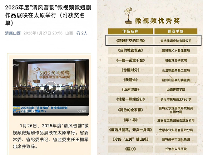 1月26日,2025年度“清風(fēng)晉韻”微視頻微短劇作品展映在太原舉行。公司紀(jì)委報送作品《跨越時空的回響——在與地質(zhì)前輩的時光碰撞中告別“躺平”》榮獲“微視頻優(yōu)秀獎”。
