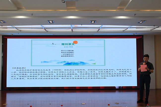 在演講比賽的中場(chǎng)休息時(shí)間,公司黨建工作部郭志雄分享了一首題為《贈(zèng)劉景文》的古詩,向大家闡述了黨員干部應(yīng)該具有“菊殘猶有傲霜枝”,不向惡勢(shì)力低頭的清廉品格。
