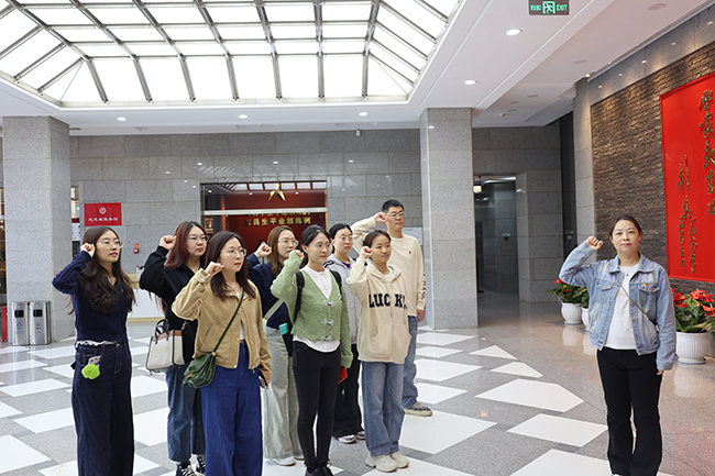 在紀念館廣場,全體團員青年面向團旗整齊列隊,團支部書記領誓重溫入團誓詞。“我志愿加入中國共產主義青年團......”鏗鏘有力的誓言回蕩在文瀛湖畔,與百年前省立一中學生“外爭主權、內懲國賊”的吶喊形成歷史回響。隨后舉行的“青春向黨”微宣講中,青年職工代表結合地勘工作實際,分享了“把青春寫在祖國大地上”的奮斗故事。“地質工作者的“三光榮”精神與五四精神一脈相承,我們要在野外勘探中踐行“永久奮斗”的青春誓言”。