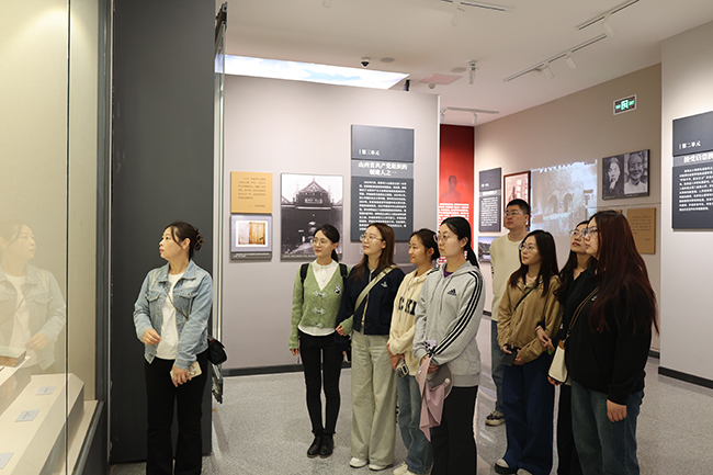 在講解員的引導下,團員青年們依次參觀了 "革命先驅"" 太原火種 ""抗戰(zhàn)烽火"" 建設歲月 "四個主題展廳。通過 300 余幅歷史照片、120 余件文獻實物、6 組場景復原,系統(tǒng)回顧了彭真同志從太原省立一中求學青年成長為黨和國家領導人的奮斗歷程,重點呈現了 1924 年中共太原支部成立這一開天辟地的歷史時刻。在" 中共太原支部成立 " 復原場景前,青年們駐足凝視,仿佛穿越回 1924 年那個熱血沸騰的年代 —— 高君宇、賀昌、彭真等革命先驅在省立一中秘密集會,宣告山西第一個黨組織誕生的歷史畫面。