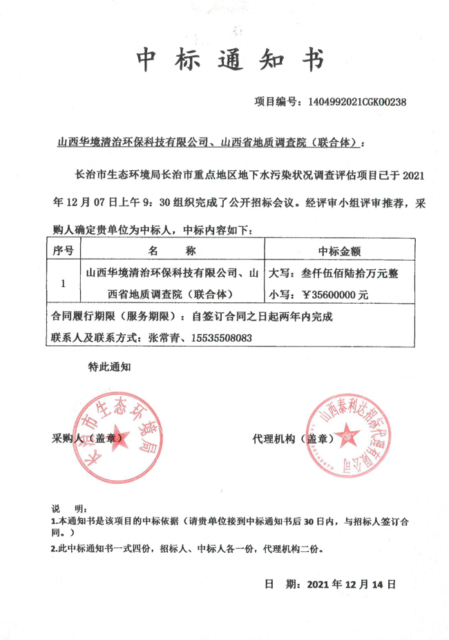 省地調(diào)院與山西華境清治環(huán)保科技有限公司作為聯(lián)合體于2021年12月7日參加“長治市生態(tài)環(huán)境局長治市重點(diǎn)地區(qū)地下水污染狀況調(diào)查評估”項(xiàng)目公開投標(biāo),并成功中標(biāo),金額為3560萬元,項(xiàng)目周期2年。