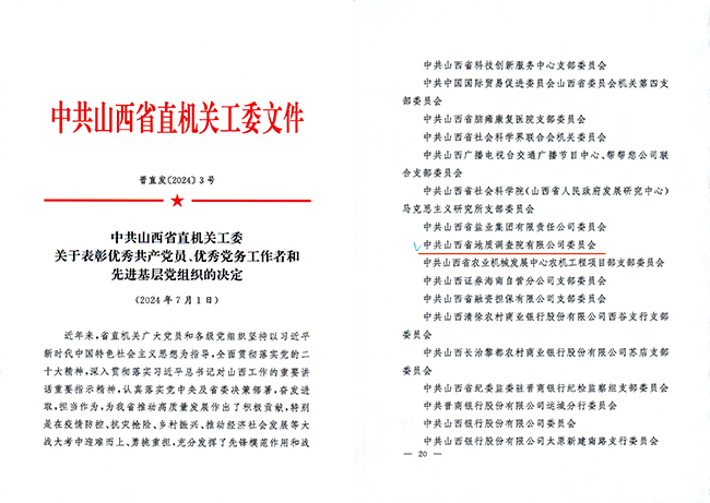 山西省地質(zhì)調(diào)查院有限公司黨委獲評省直機(jī)關(guān)工委“先進(jìn)基層黨組織”稱號