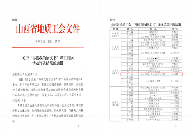 熱烈祝賀地調(diào)院有限公司翟培同志在山西省地質(zhì)工會及集團(tuán)工會組織開展的“再讀我的語文書”職工誦讀活動中大放異彩!其選送的作品《祖國啊,我親愛的祖國》榮獲三等獎。