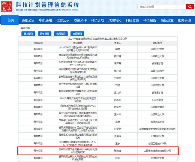近日,山西省科技廳正式揭曉2024年度基礎(chǔ)研究計(jì)劃 (自由探索類) 項(xiàng)目評審結(jié)果,全省529個(gè)獲批項(xiàng)目多花落于高校與科研院所,企業(yè)獲資助寥寥,僅7家企業(yè)有幸躋身其中,而山西省地質(zhì)調(diào)查院有限公司憑借張尚清博士申報(bào)的 “碳中和背景下赤泥復(fù)合材料凈化有機(jī)廢水的應(yīng)用研究” 項(xiàng)目,成功斬獲資助名額,一舉打破公司在山西省自然科學(xué)基金項(xiàng)目申報(bào)上長久以來的 “零記錄”。