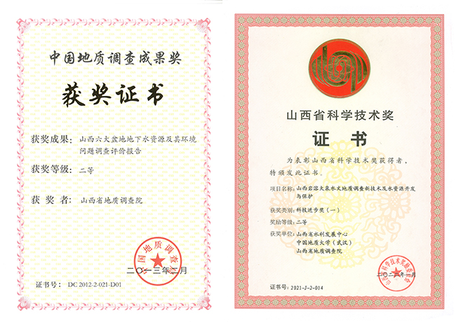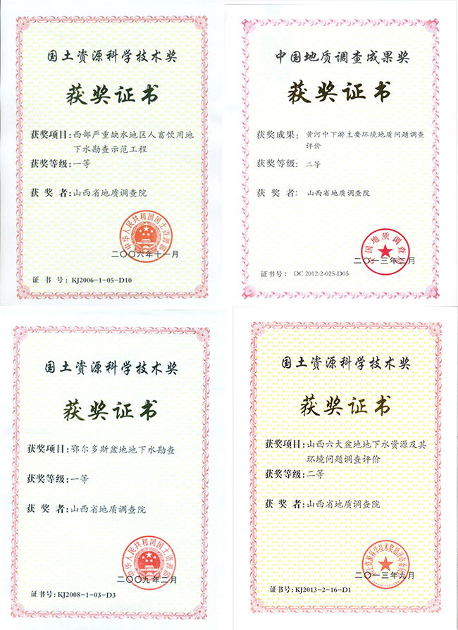 在水文地質(zhì)調(diào)查方面,《西部嚴(yán)重缺水地區(qū)人畜飲用地下水勘查示范工程》、《鄂爾多斯盆地地下水勘查》項(xiàng)目獲國(guó)土資源科學(xué)技術(shù)一等獎(jiǎng),《山西六大盆地地下水資源及其環(huán)境問(wèn)題調(diào)查》評(píng)價(jià)項(xiàng)目獲國(guó)土資源科學(xué)技術(shù)獎(jiǎng)二等獎(jiǎng)和中國(guó)地質(zhì)調(diào)查成果獎(jiǎng),《黃河中下游主要環(huán)境地質(zhì)問(wèn)題調(diào)查評(píng)價(jià)》項(xiàng)目獲中國(guó)地質(zhì)調(diào)查成果,《山西巖溶大泉水文地質(zhì)調(diào)查新技術(shù)及水資源開(kāi)發(fā)利用與保護(hù)》項(xiàng)目獲2021年度山西省科學(xué)技術(shù)二等獎(jiǎng)。2023年新開(kāi)展《山西省岢嵐縣飲水解困1:5萬(wàn)水文地質(zhì)調(diào)查》工作,提高區(qū)域水文地質(zhì)調(diào)查精度,為區(qū)域發(fā)展提供水源保障。